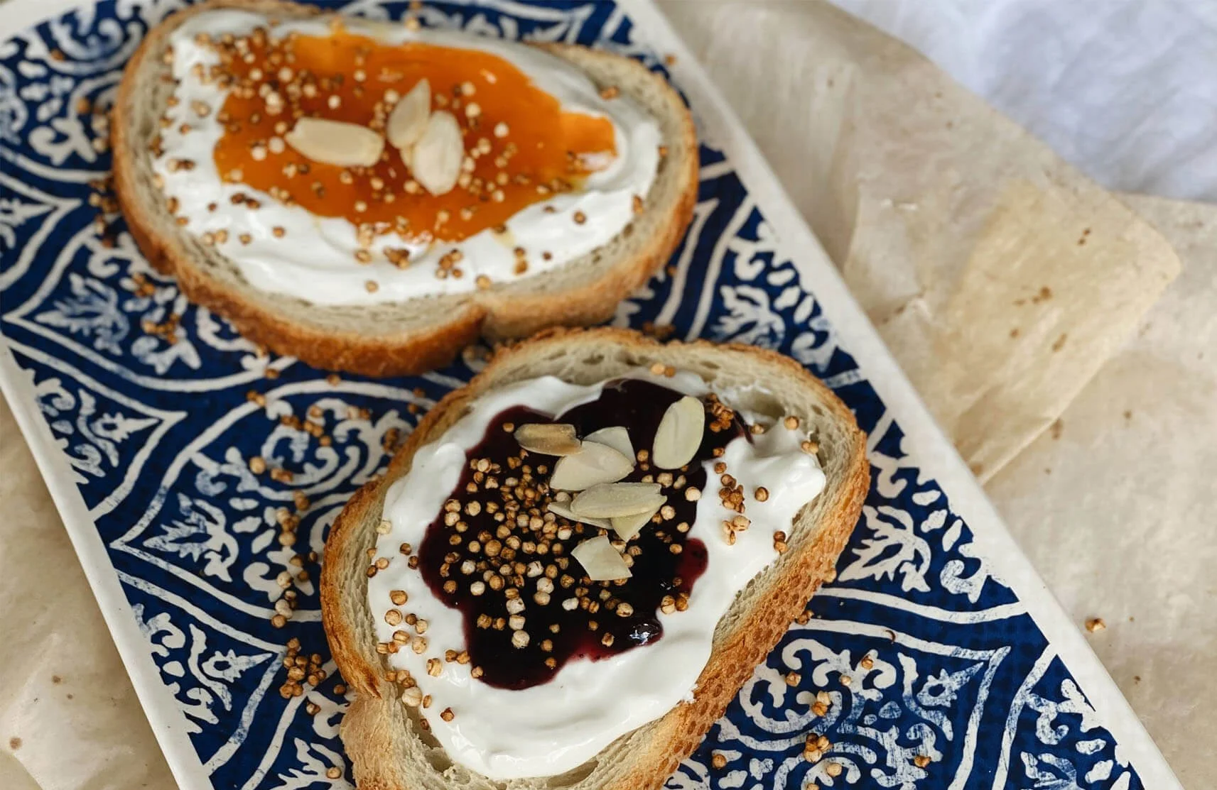 Puedes preparar esta receta con frambuesas, arándanos, banana o cualquier fruta a tu elección. Tuesta el pan y úntalo generosamente con yogur griego. Coloca la fruta sobre el yogur. Vierte un chorrito de miel de abeja natural Cyrano y espolvorea quinua pop o trocitos de almendras tostadas al gusto.